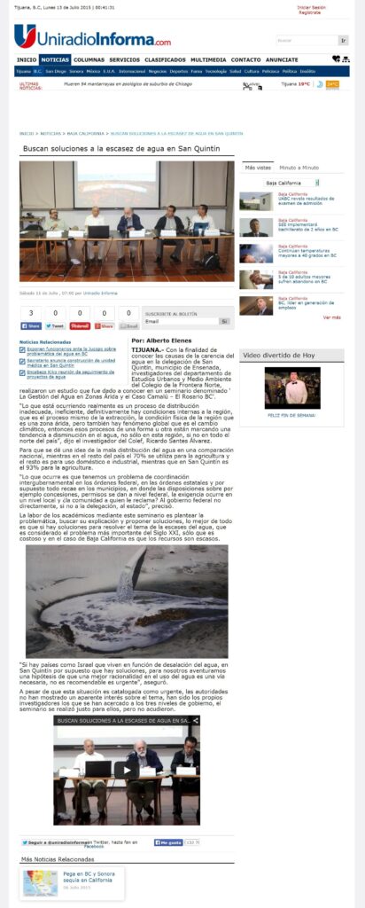 El viernes 10 de julio de 2015, en Tijuana, B.C., se realizó el Seminario “La gestión del agua en zonas Áridas: el caso de Camalú-El Rosario B.C.”, en las instalaciones de El Colegio de la Frontera Norte. El seminario trató el tema de la escasez de agua, el cual es considerado como el problema más importante del Siglo XXI.